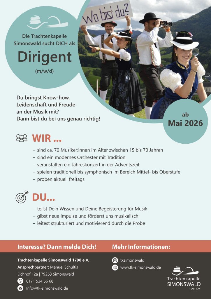 Die Trachtenkapelle Simonswald sucht DICH als neuen Dirigenten (m/w/d)! 🎶 Ab Mai 2026 möchten wir mit frischem Schwung und musikalischer